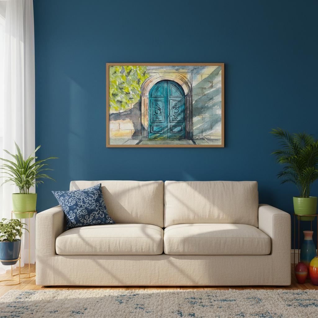 Whispering of sunlit afternoons and slow village rhythms, this watercolor invites you to wander the quiet lanes of southern France, where a stately turquoise door stands framed in weathered stone, its patina rich with stories of centuries past. Soft shadows and golden light mingle across the façade, evoking that perfect Provençal balance of elegance and ease—where every detail feels both refined and comfortably worn by time.